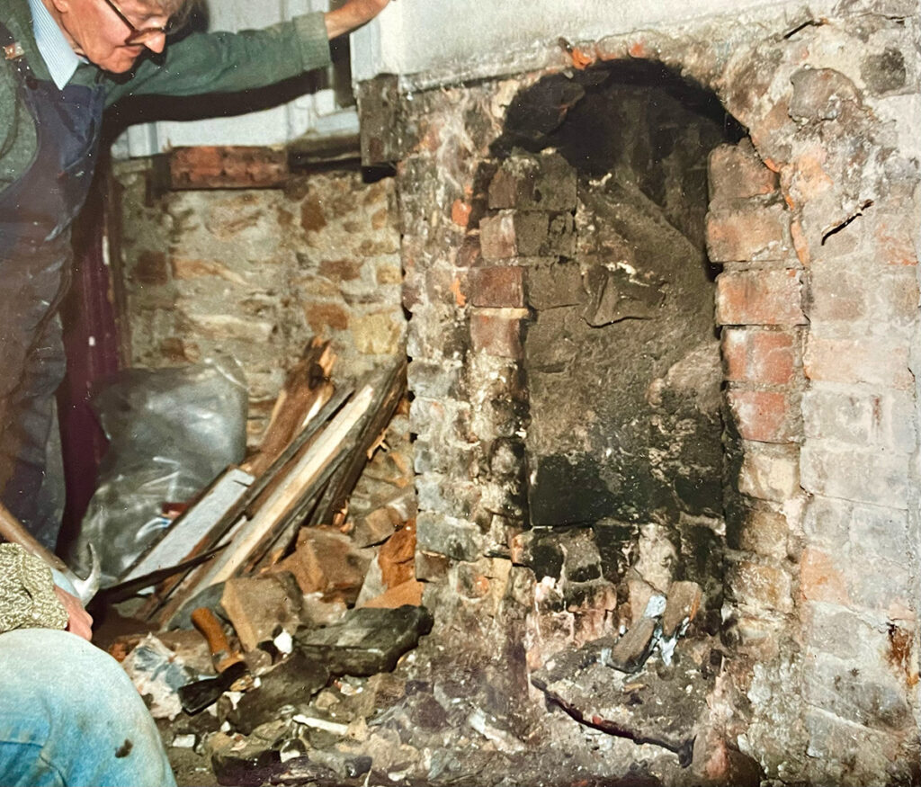 At this time there was a Victorian slate fireplace in the kitchen that had been painted over in white gloss. On one day, early in the conversion, Dave, his Dad John and Grandad Roy were having lunch sitting on the breeze blocks that were awaiting being used for the cellar walls. They’d got a fire going, probably fuelled by rotten wood from the building. The fire surround was a bit loose and had a few missing bits, so Grandad Roy suggested it would be a good idea at that point to dismantle it. Without delay he set to, removing the slate while the fire blazed on regardless. Underneath was a rather interesting looking brick arch. As we were missing a fire surround in the old waiting room, which was the grander of the two rooms, it was decided that the brick arch would stay. Unfortunately the bright green Victorian tiles that had filled the surround were too broken to be worth keeping.