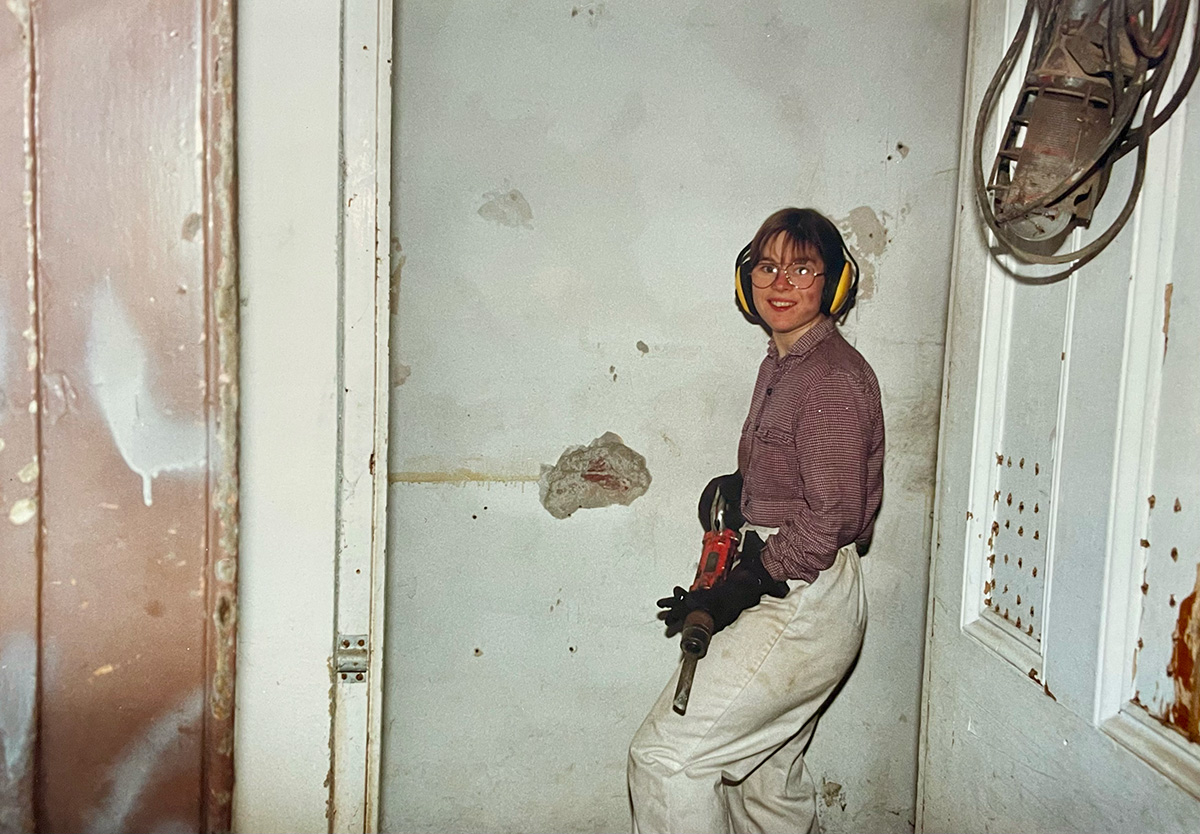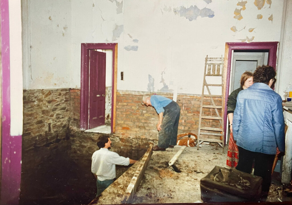 We weren’t alone in doing the work. Our families came to give a hand (Dave’s Mum Gloria is pictured carrying wood in the image above). One of the greatest helps to us in the early days was Dave’s Grandad Roy, who was a carpenter by trade. He was a lovely man. Rickets had made his legs bowed; he was one of thirteen children who’d grown up in a two bedroomed house in Plymouth with an invalid father and a mother who took in laundry. He was always very resourceful; some of Dave’s happiest memories are of trips to the dump to find treasures with Grandad Roy. He was a star to us, coming most days with a packed lunch Dave’s gran Vera had made for us all, and working tirelessly and cheerfully, whistling as he did so. The first day was comic, as I, in home-maker mode, swept the floorboards while Grandad Roy followed on behind pulling them up.