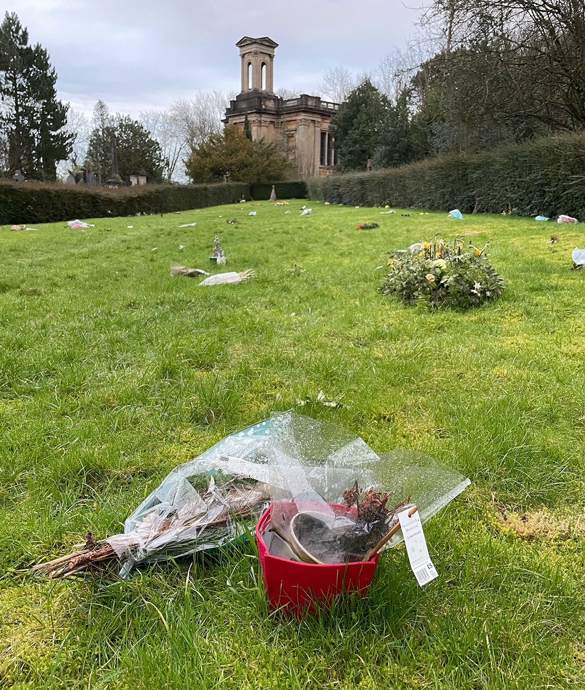 There are places where plastic waste is packaging for grief. Visiting a cemetery with a friend who’d lost her sons I was appalled to see how much plastic bouquet wrappings and plastic plant pots were littering the gardens, long outlasting the flowers. The same is seen at shrines by roads and other places where tragedy has occurred. Laying flowers in wrappers outsources the problem of the plastic to an undesignated third party. When laying flowers, please take the wrapping away with you. The flowers will be more beautiful for being seen. And rather than putting a pot of plastic flowers on a grave, a clay pot with a plant or bulbs will stay fresher and last far longer.