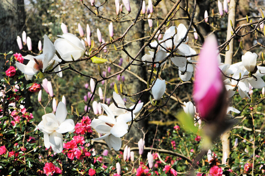 The Repton designed Antony Woodland Gardens has an abundance of camellias and other early flowering garden trees. The woodand walk at Antony is open all year, while the formal gardens open from 15th February.